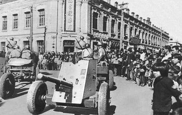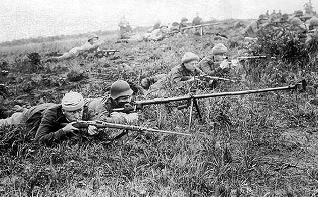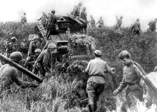 A Soviet SU-76M SPG and riflemen of the 35th Army advance on the Japanese fortified town Hutouzhen (north of Viadivostok) on 14 August 1945.