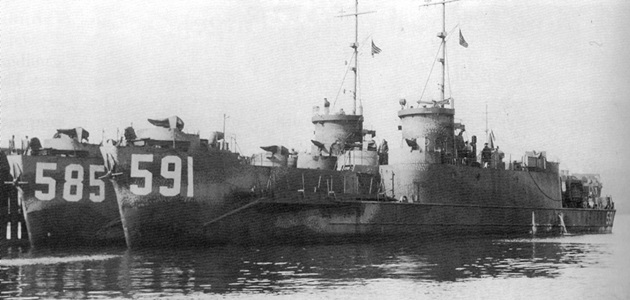 Large infantry landing craft USS LCI(L)-585 and USS LCI(L)-591 at Cold Bay in the spring of 1945 awaiting transfer to the Soviet Navy. The Soviet Navy designated the LCI(L) type as Desantiye Suda (“Landing Ship”) or DS. On 10 June 1945, they were commissioned in the Soviet Navy and re-designated DS-45 and DS-35, respectively.