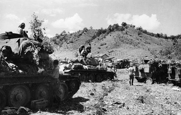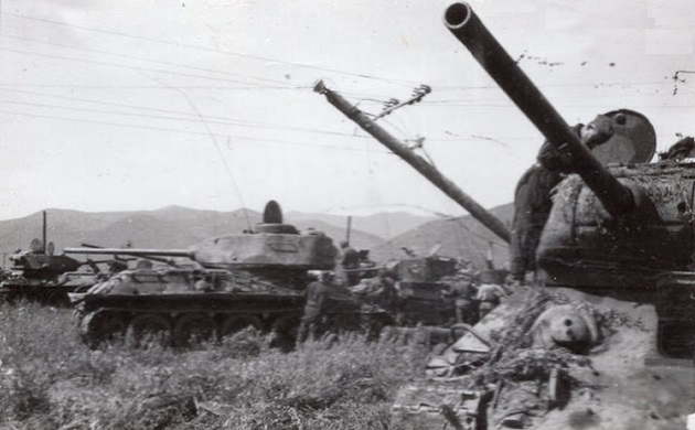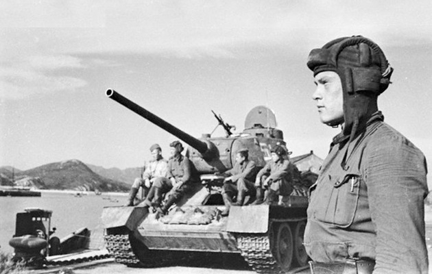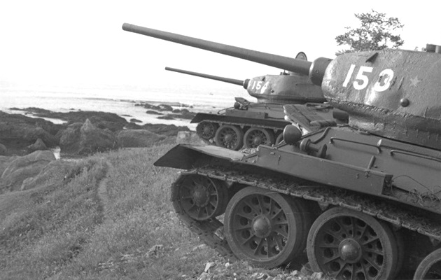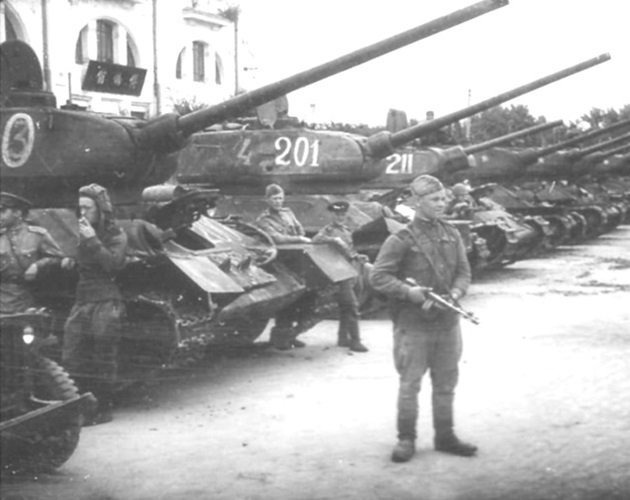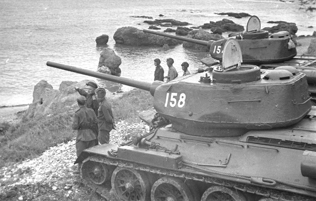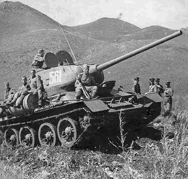 Soviet tanks on the Yellow Sea coast near Dairen, August 1945. Note T-34/85 number 153 has a small red star to the right of the turret number.