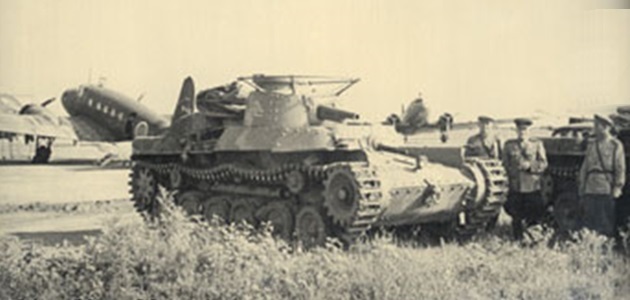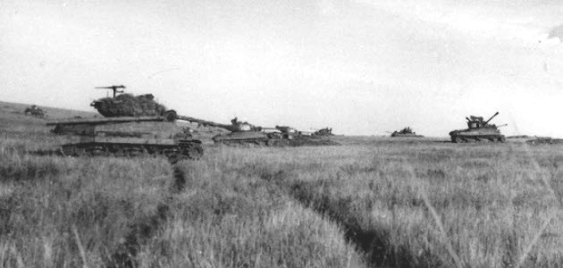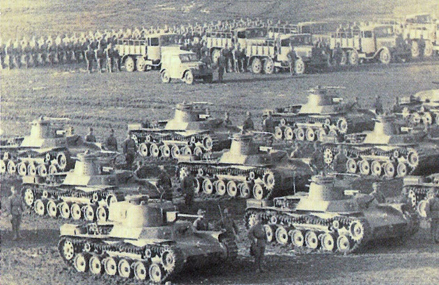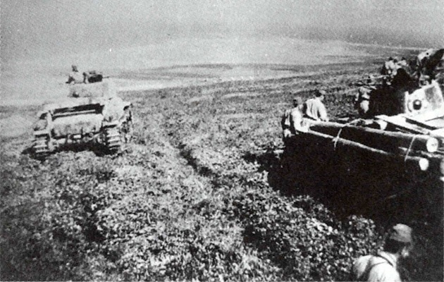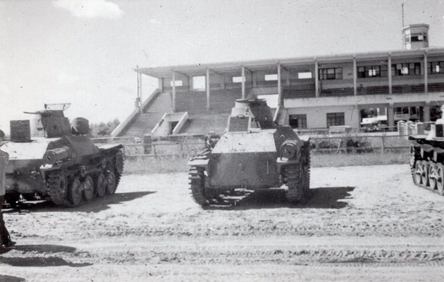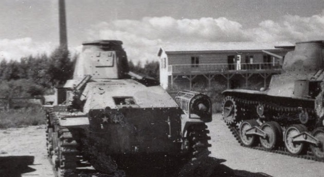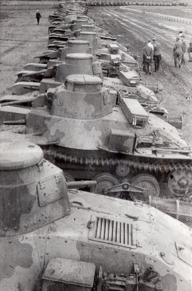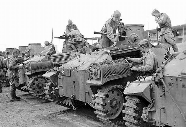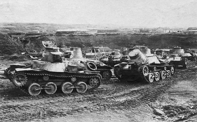 Japanese tanks advancing on Shumshu. The tank on the right has unditching logs lashed to its fender.