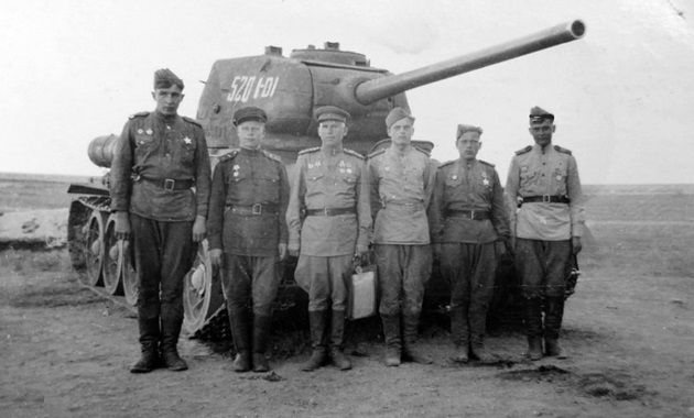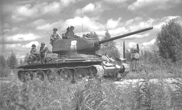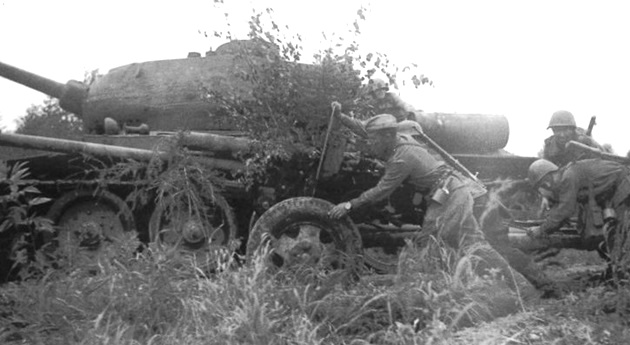 A Soviet T-34/85 tank passing by a Soviet 76mm Divisional gun M1942 (ZiS-3). The artillery crew is pushing the gun into a firing position.