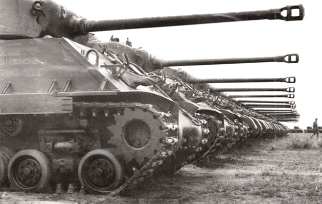 This is a photo of the tanks further down the line with complete sand shields. There is no information on how many of the tanks had the HVSS Suspension with the wide tracks.