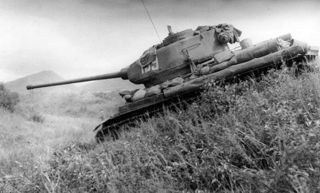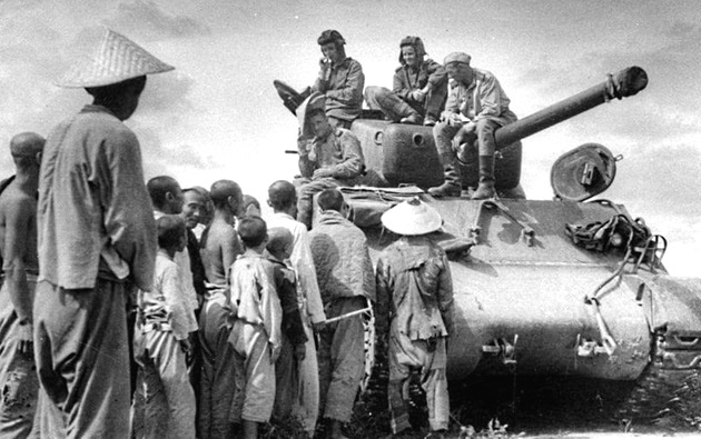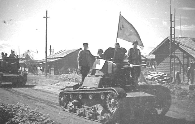 Soviet T-26 tanks advancing through southern Sakhalin. The lead tank appears to be flying a “Cease Fire” flag hoping that Japanese troops would not fire on them and surrender.