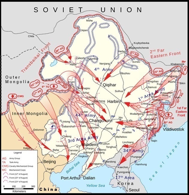 The Soviet invasion of Japanese-held Manchuria, formally known as the Manchurian Strategic Offensive Operation or simply the Manchurian Operation and sometimes, mainly in the West, as Operation August Storm was the last major land battle of WWII. The Soviets also made the last amphibious landings of the war when they liberated South Sakhalin Island and the Kuril Islands. The last tank attack of WWII occurred on the Kuril Island of Shumshu.