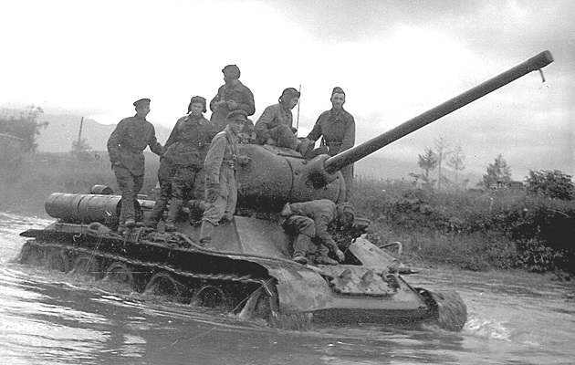 A Soviet T-34/85 tank carrying troops crossing the a river (probably the Poronai) in South Sakhalin.