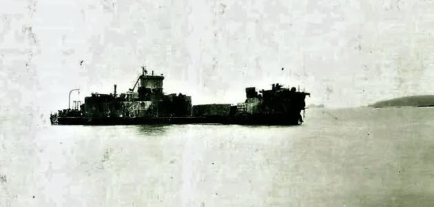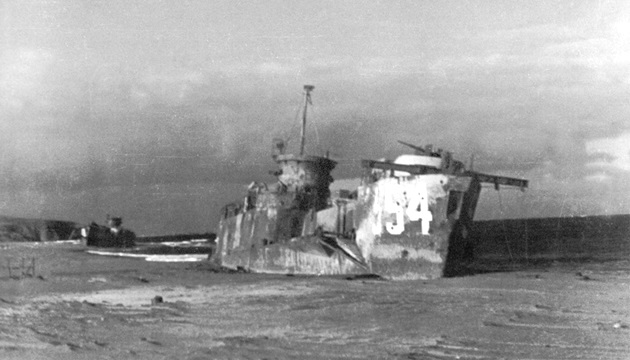 US-built Soviet landing craft DS-5 was hit by Japanese coastal artillery fire and sunk at the landing site on Shumshu.