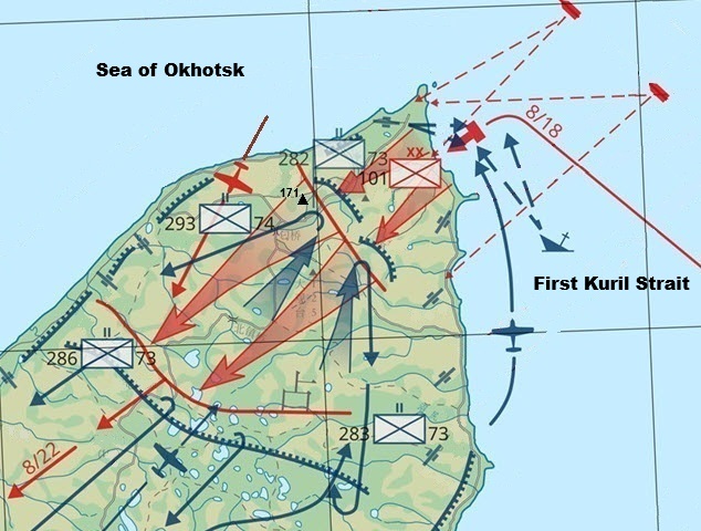 Soviet forces which landed on Takeda-hama around 0400 hours on August 18th pushed inland and occupied the strategic high ground, Hill 171. There is no information if any Japanese units was occupying Hill 171 or which Soviet unit(s) captured the hill during the invasion.