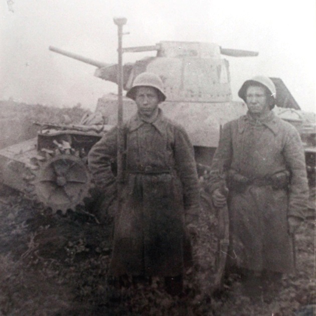 Two Soviet Marines probably of the 365th Marine Battalion posing by a knocked out Japanese Type 95 Ha-Go light tank. The Soviet marine on the left is holding a PTRD-41 (ProtivoTankovoye Ruzhyo Degtyaryova), which is a single-shot anti-tank rifle that fires a 14.5×114mm round. Note the foggy weather.