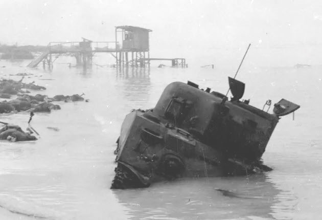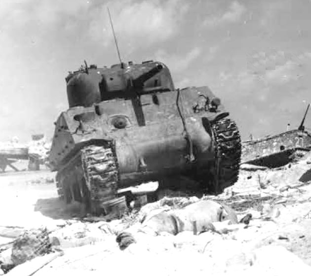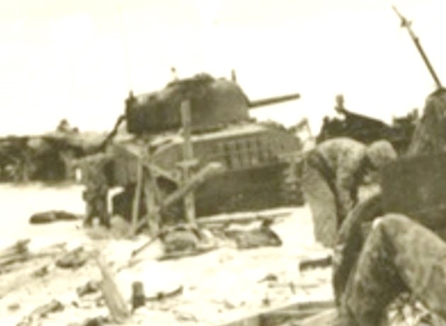 Rear view of Sherman CECILIA on Beach Red 1 surrounded by bodies of US Marines.