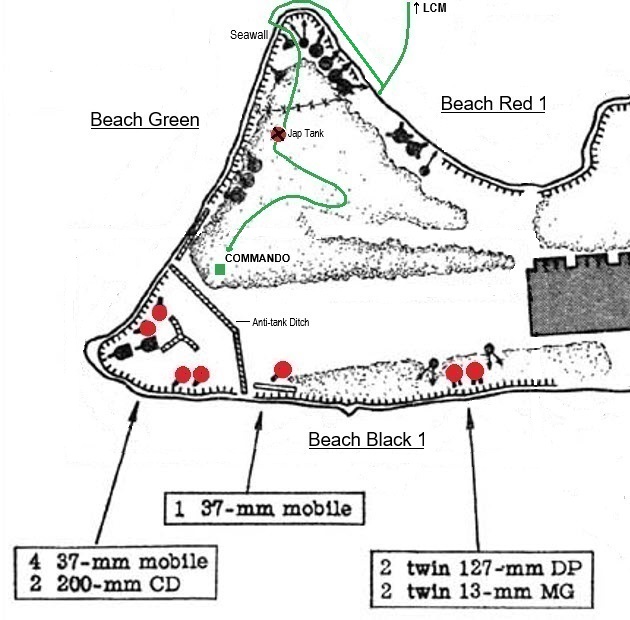 Infantry reports stated COMMANDO destroyed two five-inch (127mm) anti-boat guns and several (some reports stated five) enemy pillboxes and fighting positions. The two five-inch guns were Japanese Twin Type 89 (1929) 127mm Anti-Aircraft guns which the Japanese Imperial Navy used on their ships.