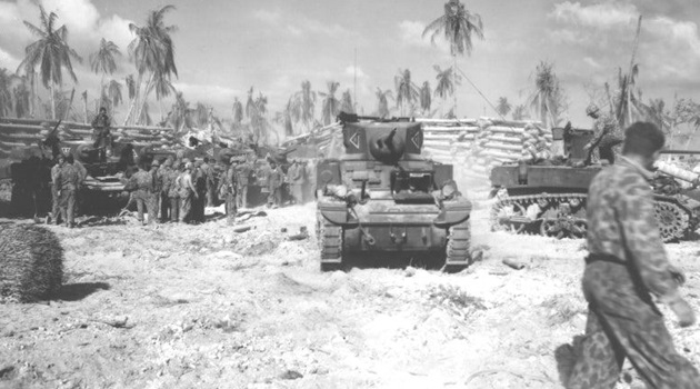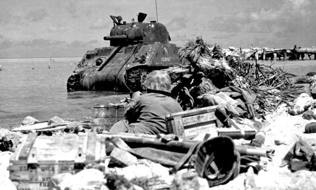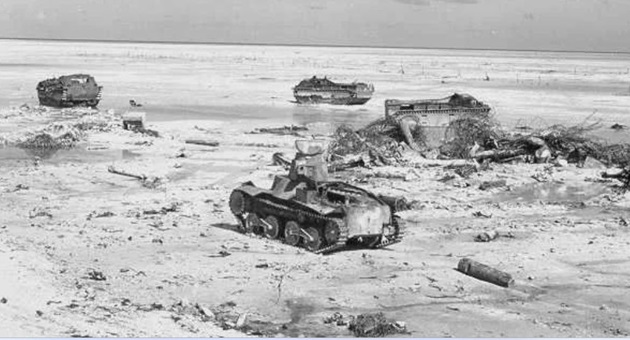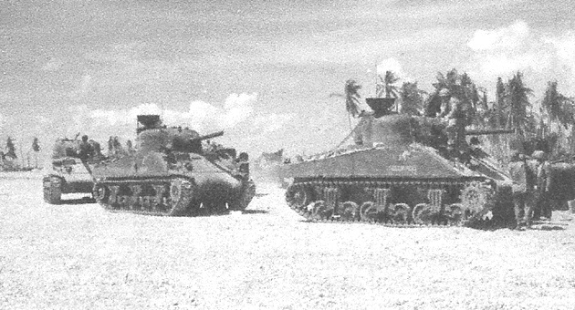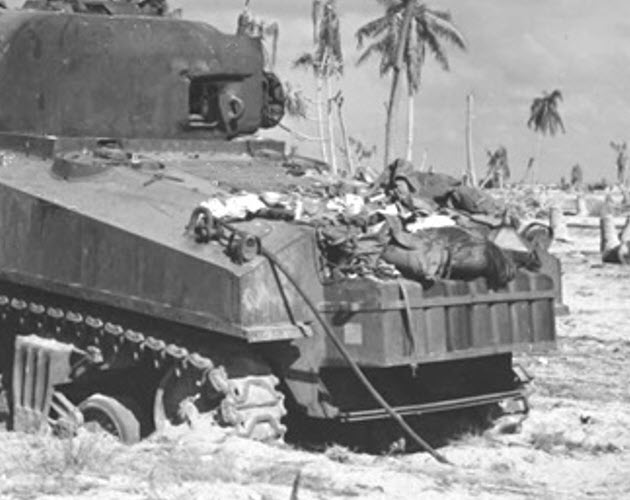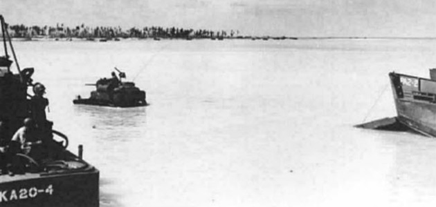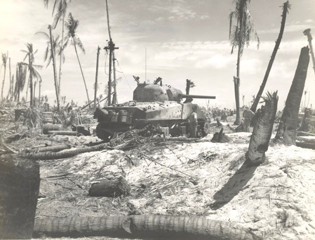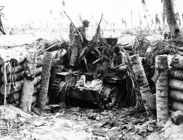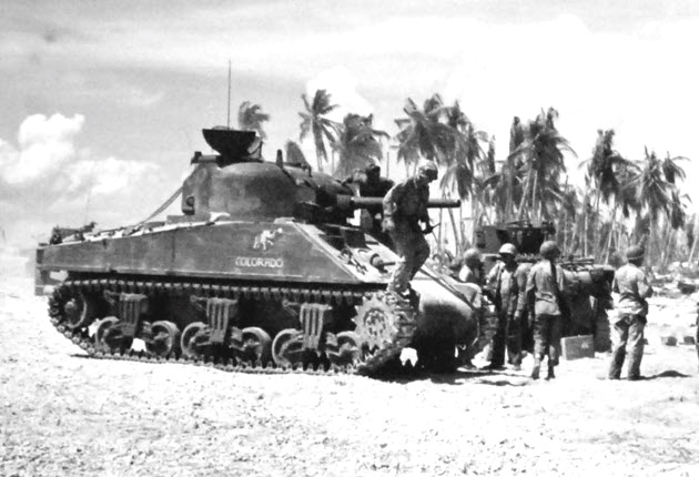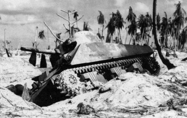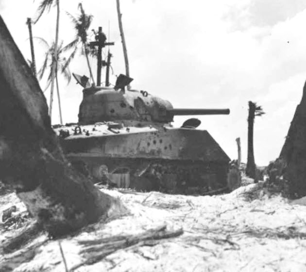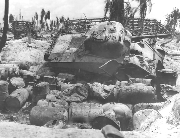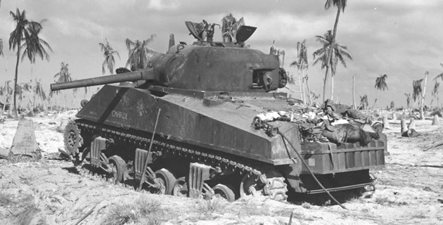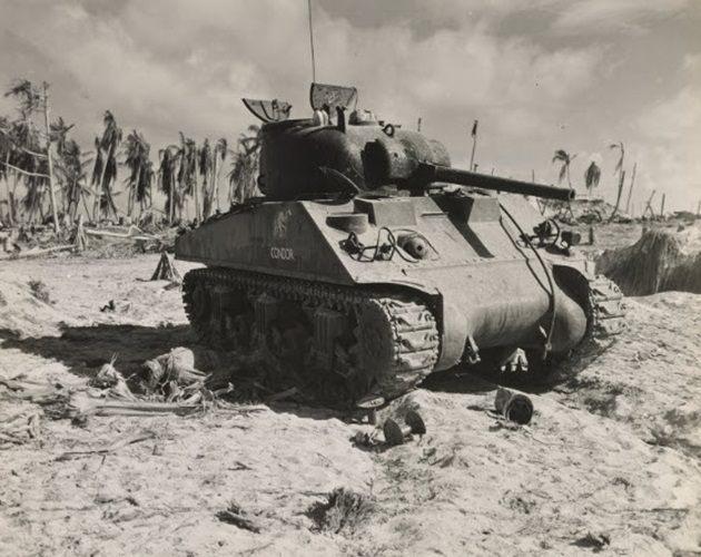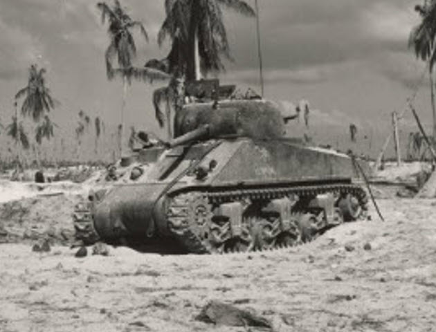 The Battle of Tarawa (20-23 November 1943) was the first US large-scale amphibious assault on a heavily fortified Japanese island during WWII. This battle is the first time the US Marine Corps deployed the Sherman tank in combat and the Marines first tank-vs-tank engagement with a Japanese tank. On Tarawa, LVTs (amtracs) were used for the first time as assault vehicles.