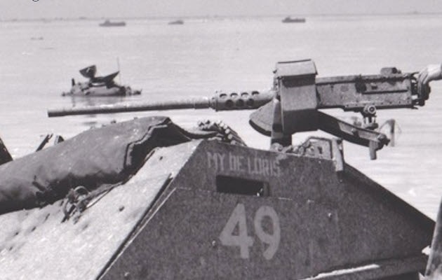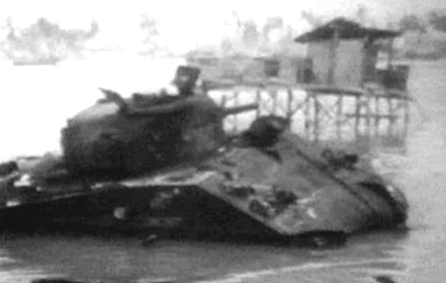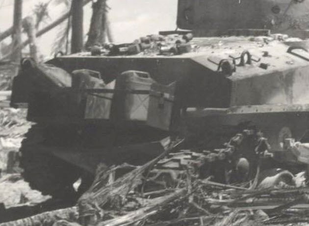 On the morning of the second day (the 21st), CECILIA with a bad gun tube moved up and down the beach and in the water fired its machine guns at Japanese machine gun positions. Near the junction of Beaches Red 1 and Red 2, CECILIA slid into a large, water-filled bomb crater that had been obscured by silt and tumbled sideways. The impact or water caused the tank’s electrical system to short out, and the turret could not be rotated manually due to the steep angle. The crew was forced to abandon the tank.