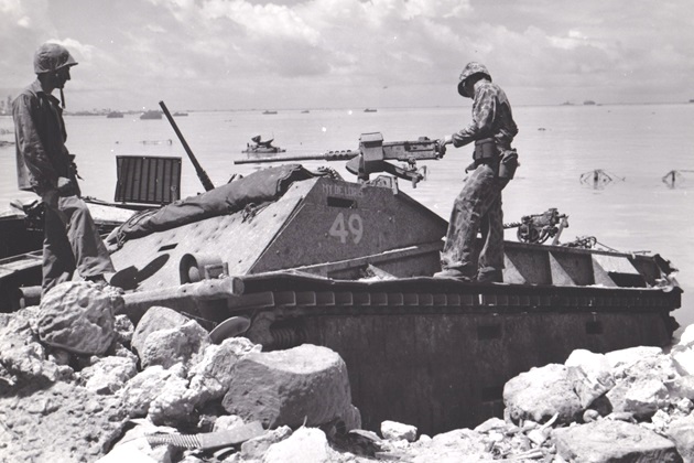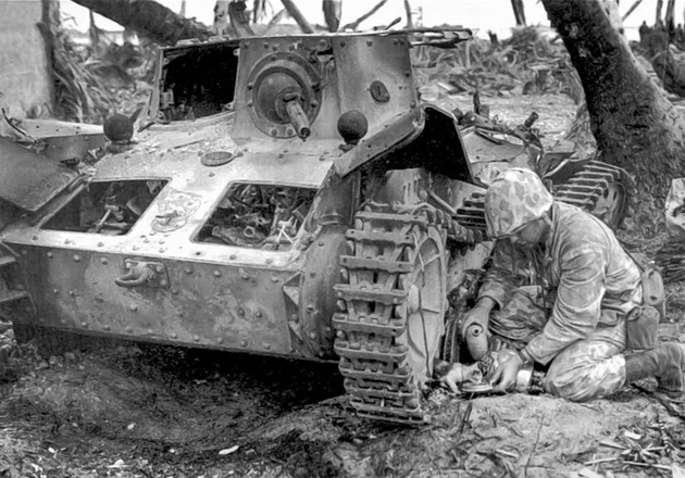 Two Marines are looking over a dug-in Type 95 Ha-Go tank which was used as a pillbox. Note the damage to the tank’s right track and sprocket.