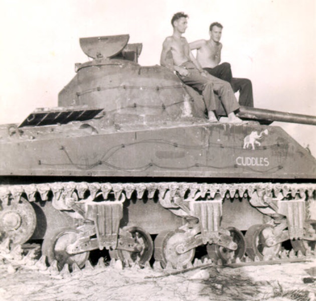 Sherman named CECILIA belonged to the company commander, First Lieutenant Edward Lewis Bale Jr. (19 March 1920 to 21 December 2017). The crew consisted of Sergeant Michael E. Shivetts (radio operator/loader), Private Charles E. Martin (gunner), Sergeant Robert M. Keller (assistant driver), and Corporal Alfonso A. Chavez (driver). The tank was named after Chavez’s newborn daughter, Cecilia Chavez, born on 23 March 1943.