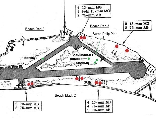 At about 1130 hours, CECILIA and COMMANDO moved around the small peninsula at the boundary of Beach Red 1 and Green Beach. About 50 yards (45.72 meters) down Green Beach, they found a low spot on the seawall and they were able to get through. Apparently, the Japanese used this spot to move trucks and equipment out onto the reef at low tide. They did not see any Marines. There were a lot of Japanese running and they started shooting at them with machine guns.