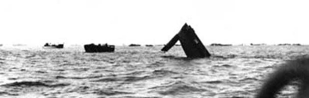 A US Navy LCM-3 sinks seaward of the reef after receiving a direct hit by Japanese gunners. This craft may have been one of the four LCMs carrying M3A1 tanks, all of which were sunk before reaching the reef.