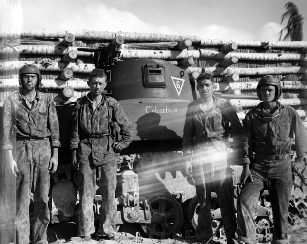The crew of a Company C M3A1 light tank named “Columbus” pose in front of their tank next a revetment wall. It appears that the direction of where the triangle on the turret is pointing indicates the company, pointing up (A Company), pointing left (B Company), and pointing down (C Company).