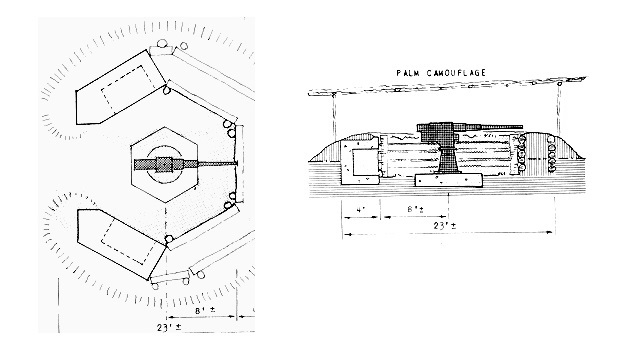 The Type 88 guns were mounted in specialized five-sided, open-top emplacements dug roughly 5 feet (1.524 meters) into the ground and revetment was usually built with materials like concrete, coconut logs, boards, or empty drums. The palm camouflage above the position was made of palm tree fronds and not added if the gun is used for anti-aircraft fire.