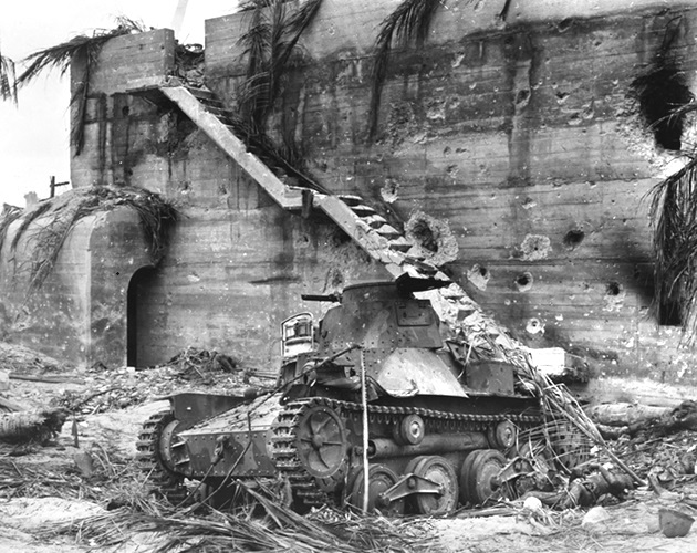 This is the south side (the rear) of Rear Admiral Keiji Shibasaki’s command bunker. Beach Red 3 is not far behind it. This imposing bunker withstood direct hits from US Navy 16-inch (406.4 mm) shells and aerial 500-pound (226.8 kg) bombs. In the foreground on the right is a Ha-Go tank. Note a tank turret is laying on its side on the ground next to the tank and in the background to the right of the bunker is knocked out tank without a turret. The two tanks were immobilized by a lack of fuel.
