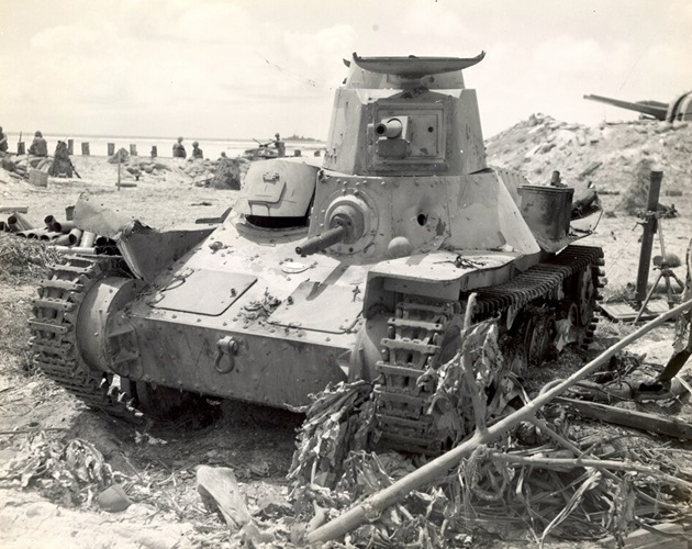 A knocked out Type 95 Ha-Go tank on a beach. In the background on the right, appear to be the barrels of Twin-Mounted 127mm guns. This might be Beach Black 1 on the southwest side of the island.