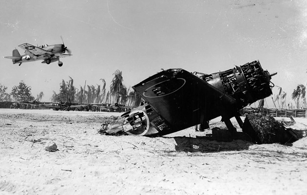 On 29 November 1943, a F6F-3 Hellcat landing on Betio. In the background, US planes and airfield vehicles are parked in the revetments. In the foreground is the remains of a Mitsubishi A6M2 “Zero” fighter.