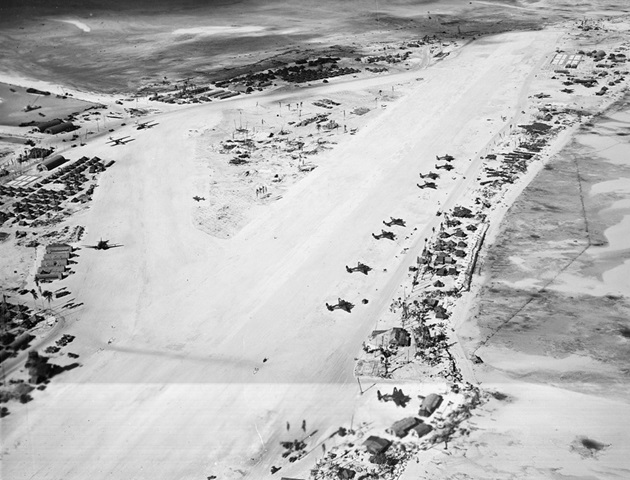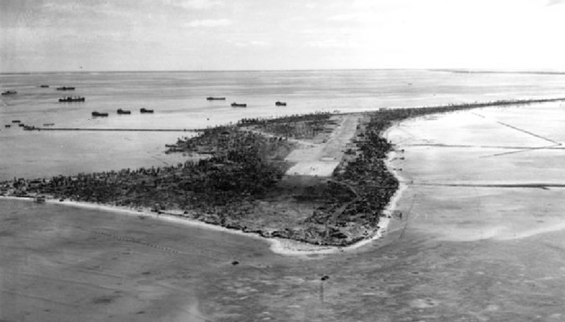 This aerial view of the landing approach to the airfield on Betio was taken in December 1943, two weeks after US forces captured Betio.