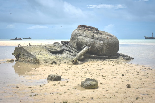 At low tide, the remains of LVT-1 or LVT-2 Amtracs (amphibious tractors), sunken landing craft, and some wreckage of B-24J “Miss Bee Haven” off shore can be seen.